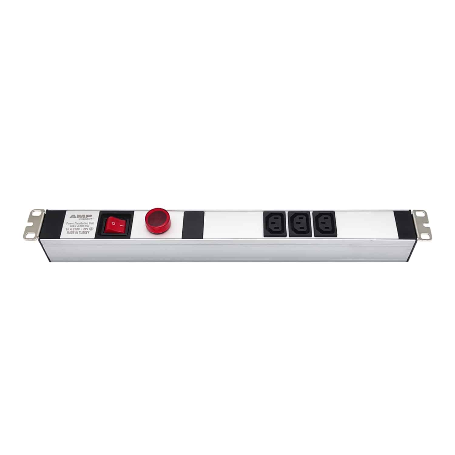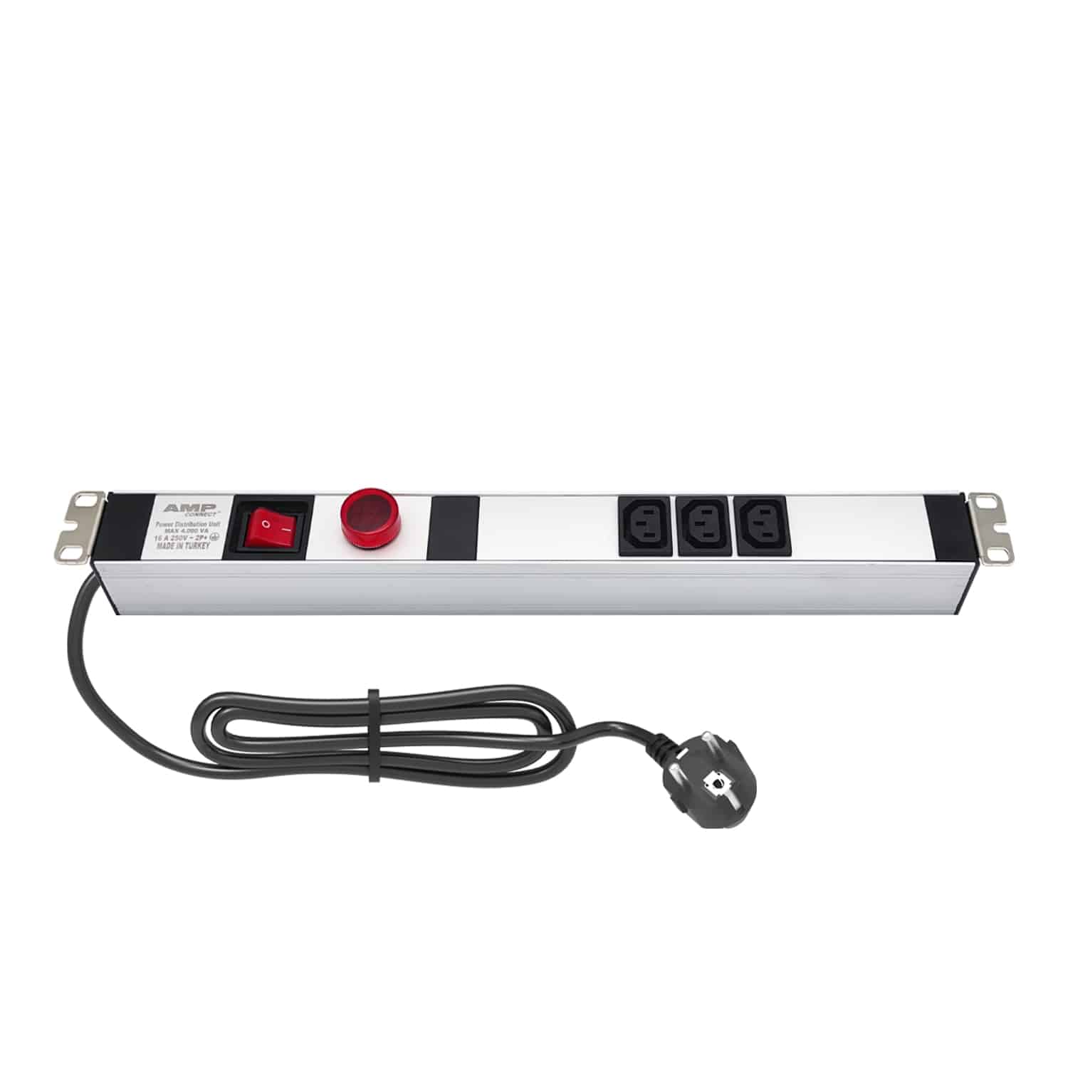 19” 1U 3 WAY IEC320 C13 SOCKET WITH CURRENT AND VOLTAGE DISPLAY, ON / OFF LIGHTED SWITCH, 3X1,5 mm² NYMHY CABLE, ALUMINIUM PROFILE FRAME POWER DISTRIBUTION UNIT