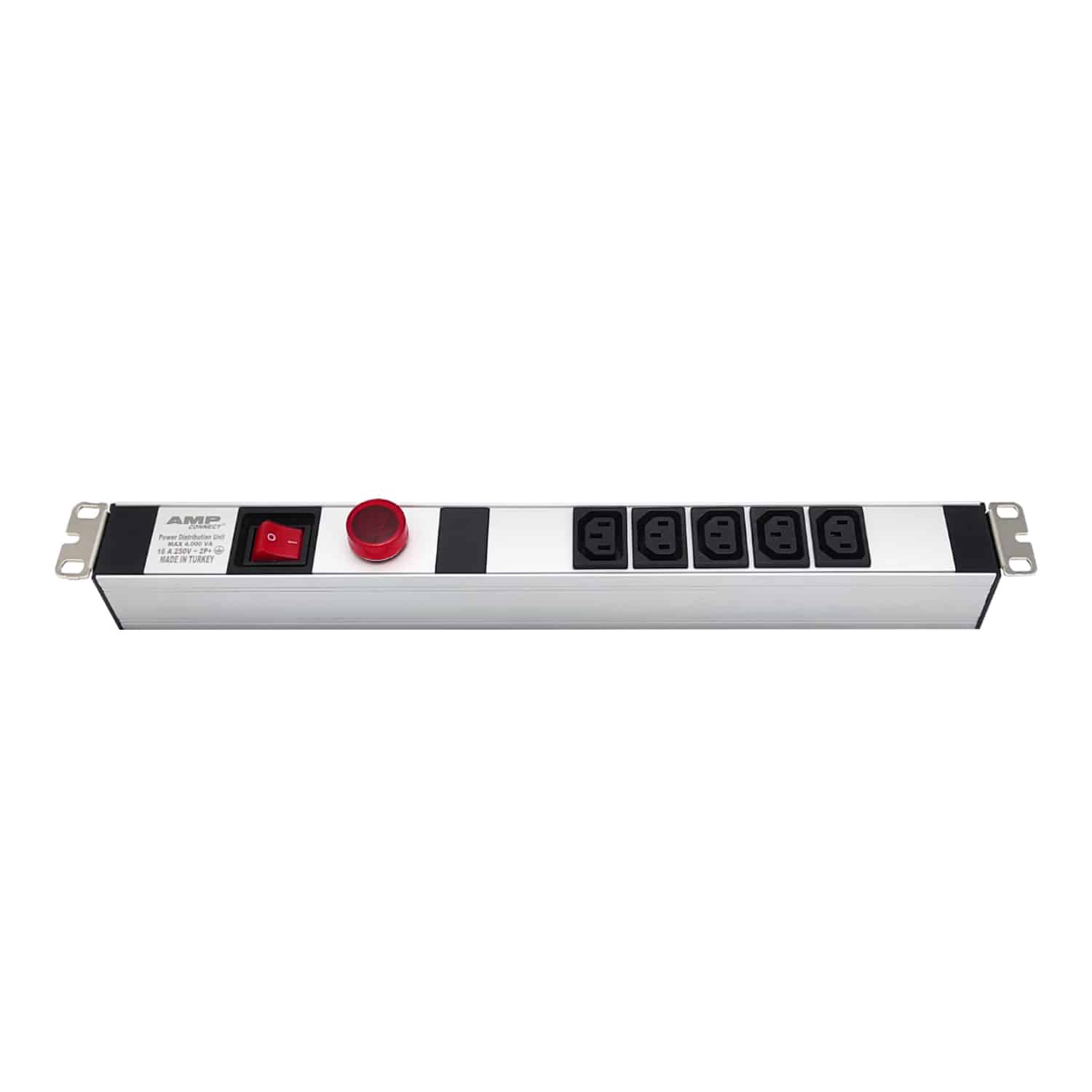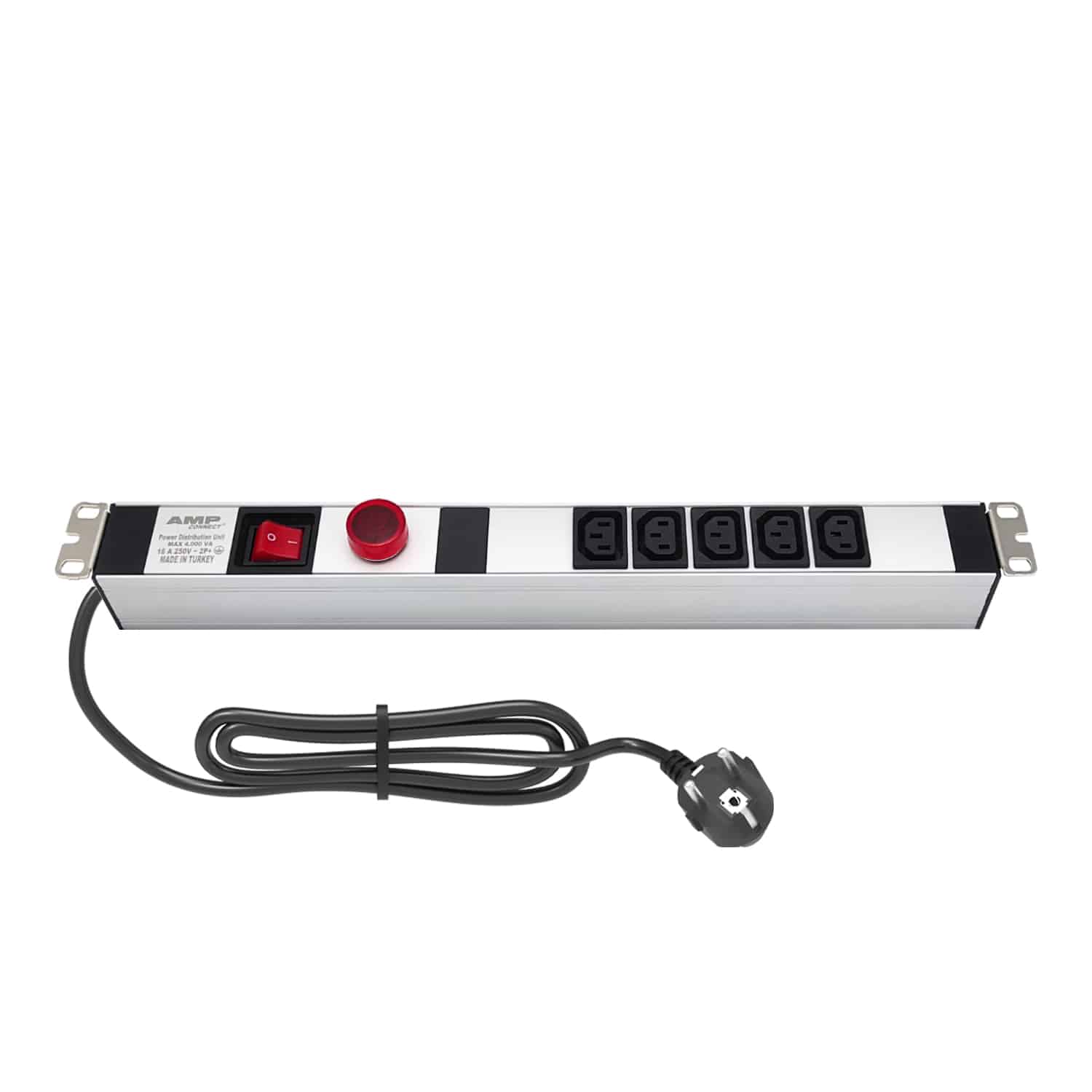 19” 1U 5 WAY IEC320 C13 SOCKET WITH CURRENT AND VOLTAGE DISPLAY, ON / OFF LIGHTED SWITCH, 3X1,5 mm² NYMHY CABLE, ALUMINIUM PROFILE FRAME POWER DISTRIBUTION UNIT
